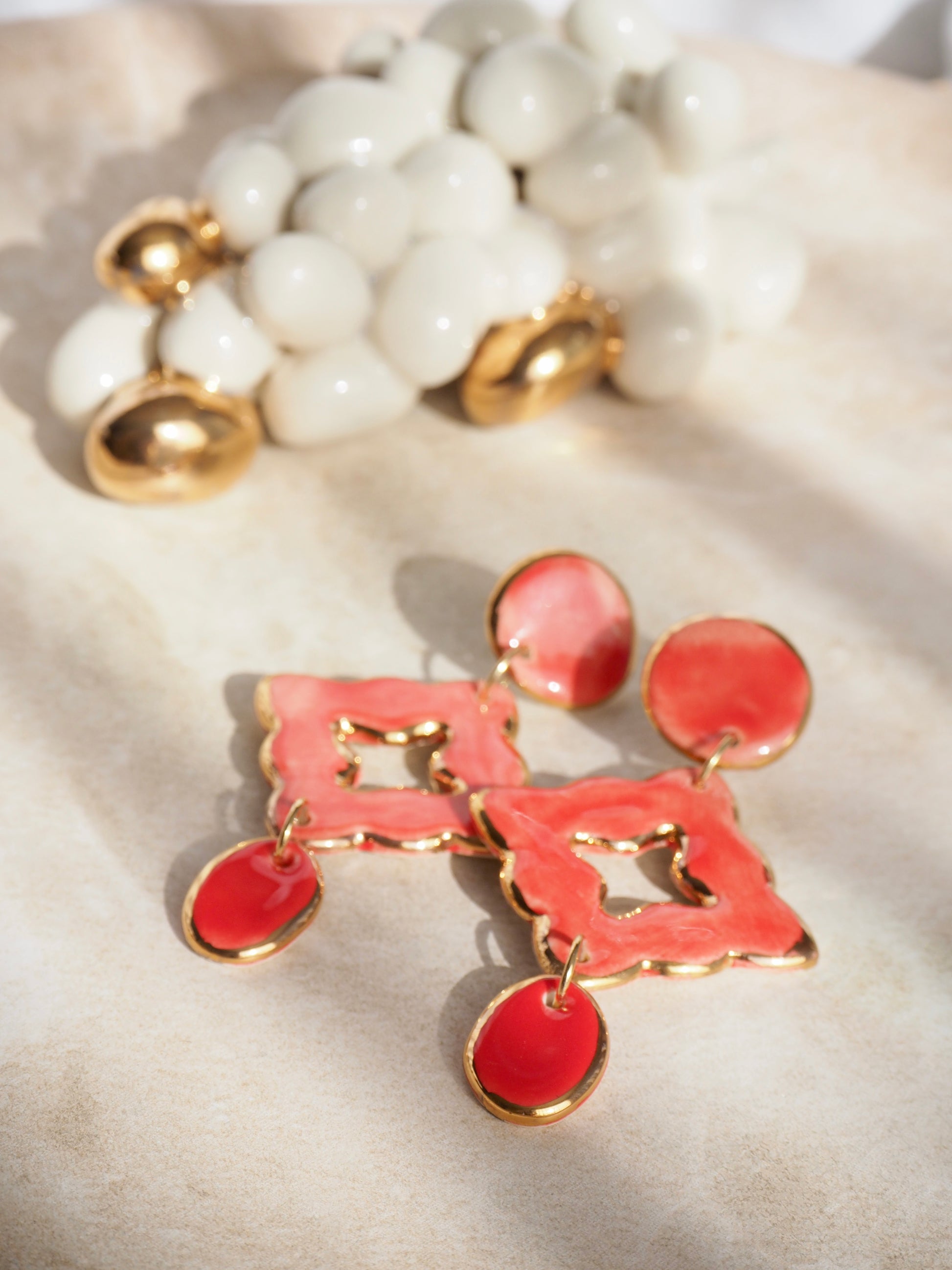 “A Feast for your Eyes” Handmade Porcelain Earrings in Warm Red coloured glaze with 24k gold lustre details.