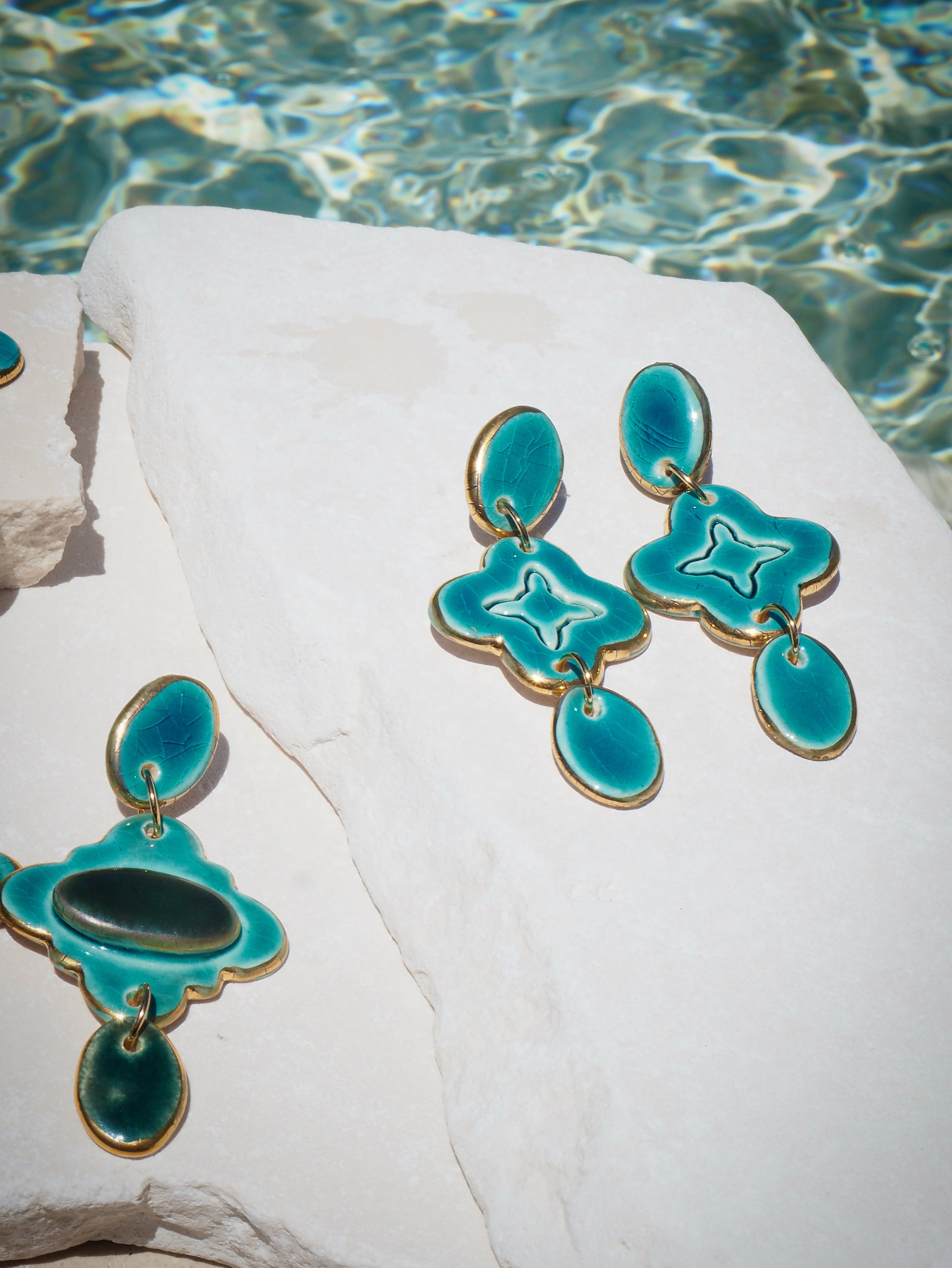 All Earrings’s porcelain clay pieces were fired three times in a Ceramic Kiln for bisque firing, glaze firing and gold lustre firing.
