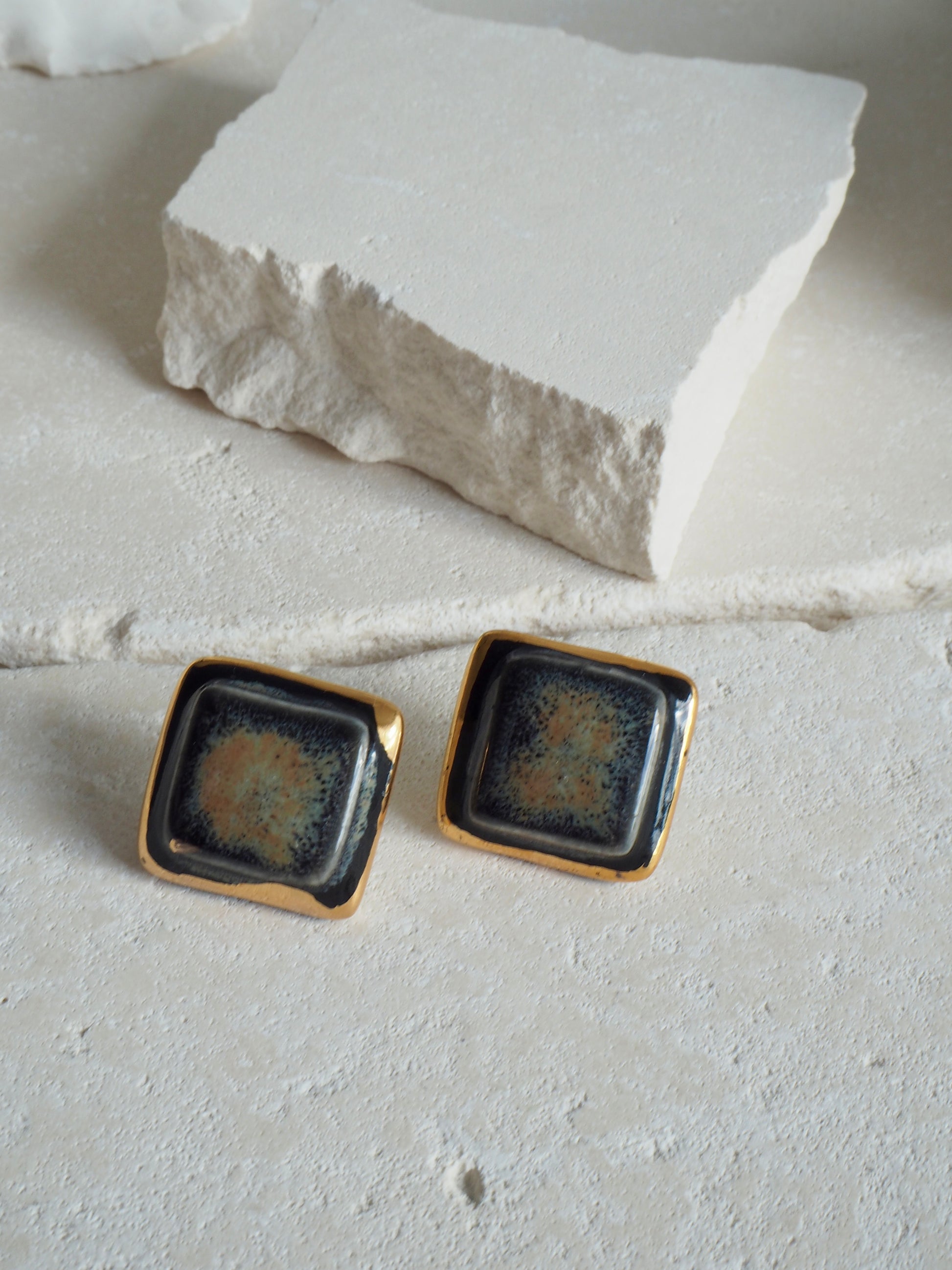“il Quadrato” Medium Handmade Porcelain Studs coloured with “Black Galaxy” glossy glaze with 24k Gold lustre details