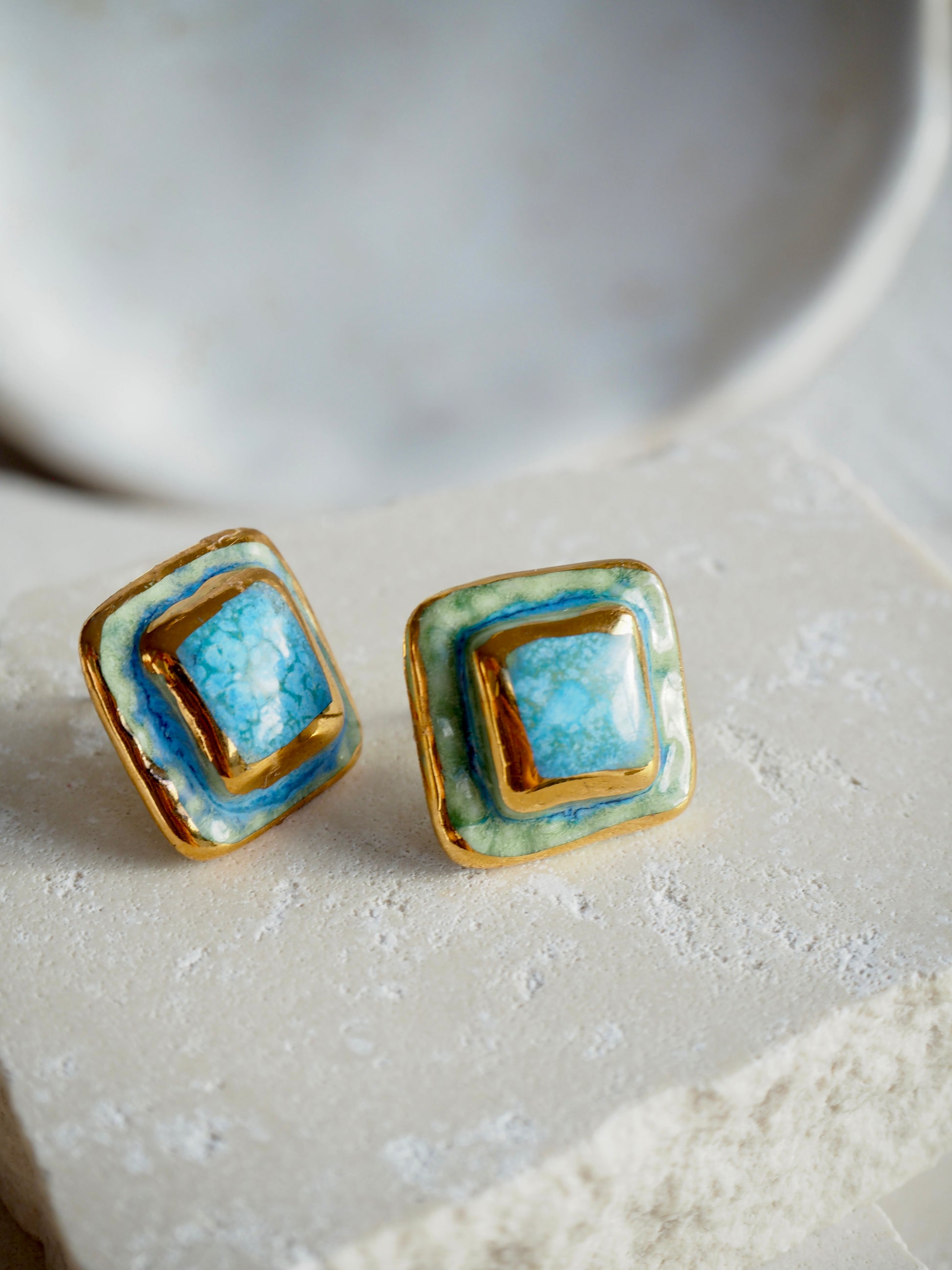 “il Quadrato” Small Handmade Porcelain Studs coloured with “Blues&Greens” glossy glazes with 24k Gold lustre details