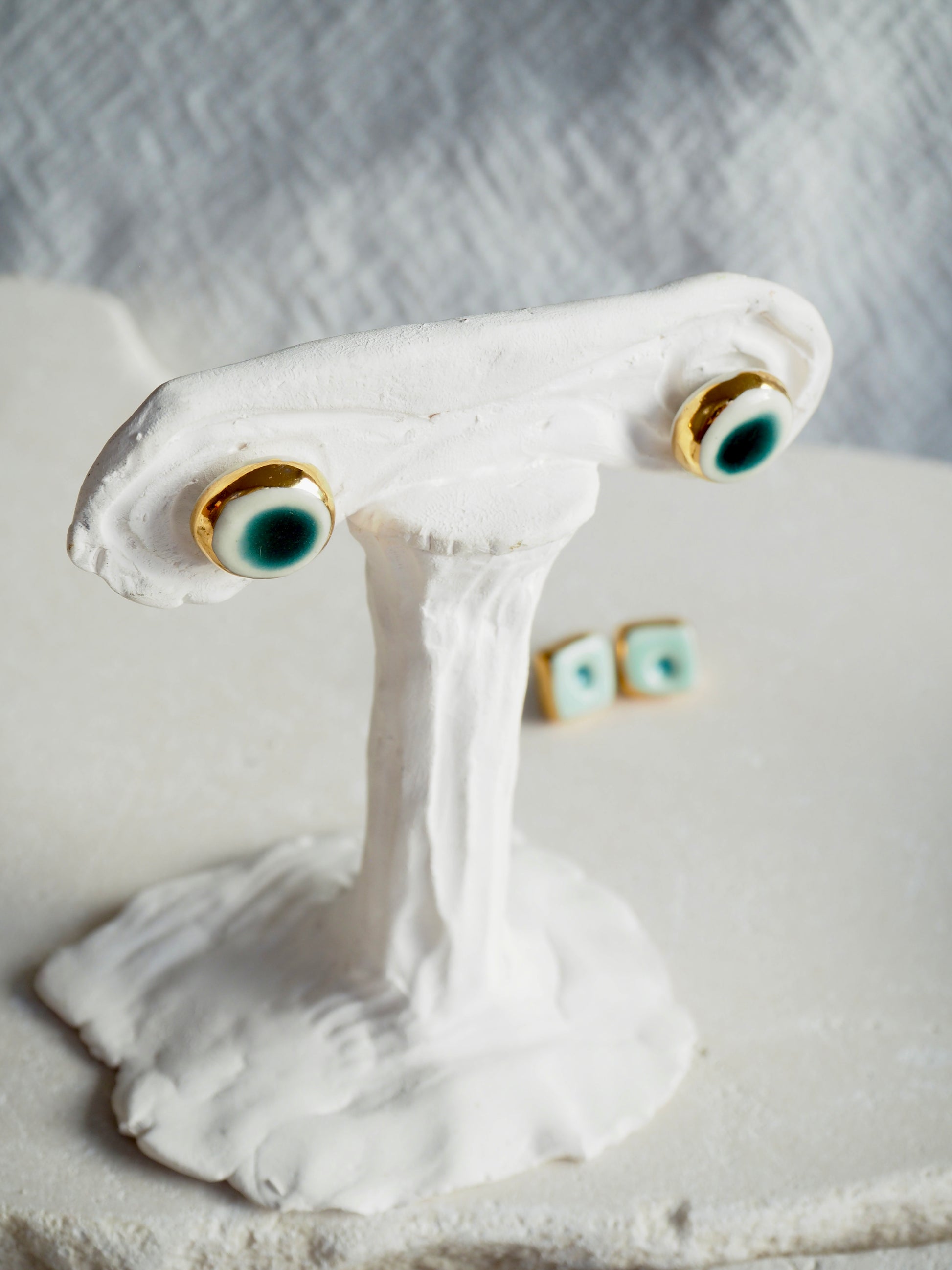 “il Quadrato’s Fontana” Small Handmade Porcelain Studs coloured with Italain Green glossy glaze with 24k Gold lustre details