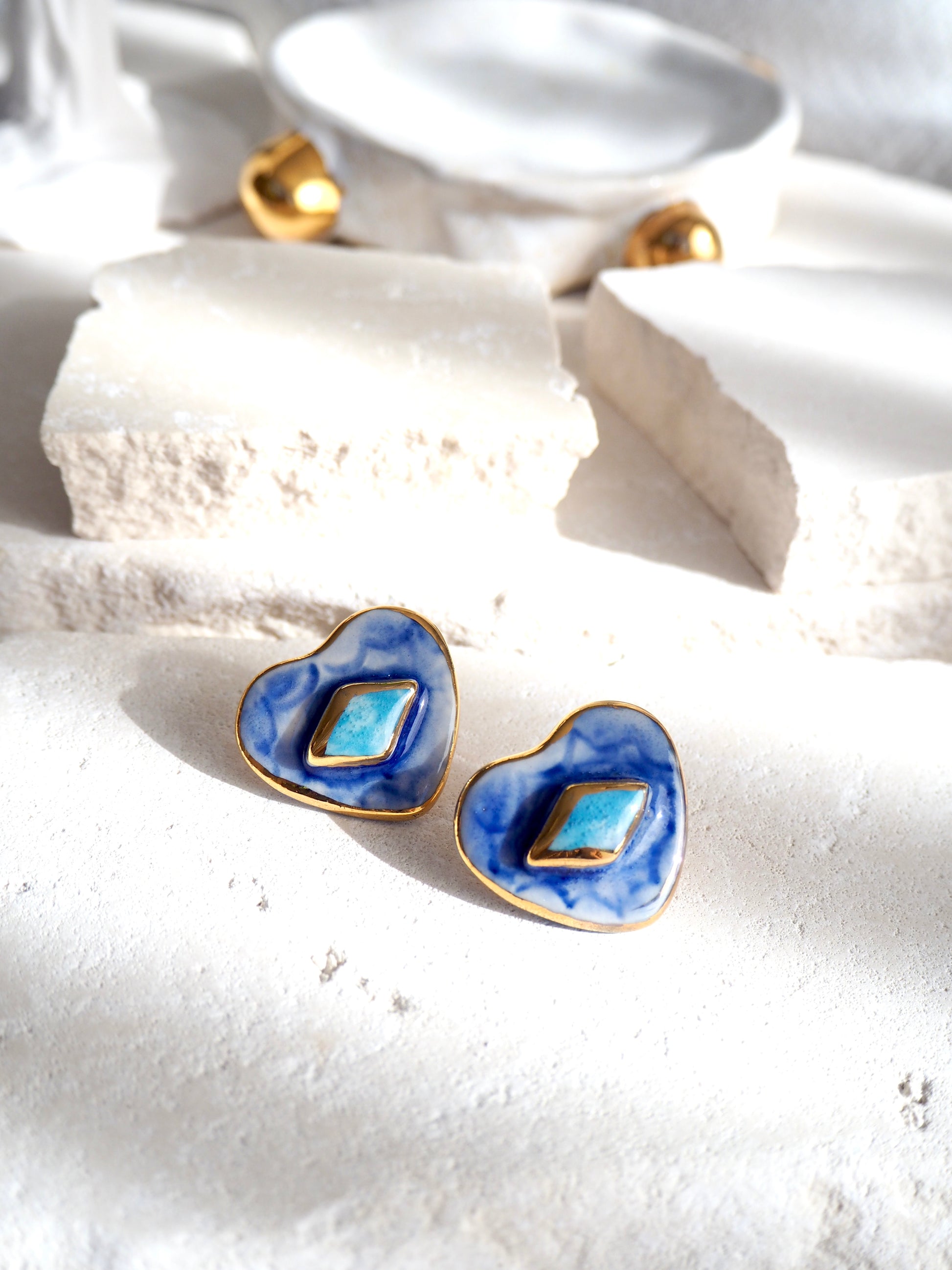 Large Handmade Porcelain Heart Stud Earrings coloured with “Shades of Blues” glossy glazes & 24k Gold lustre details