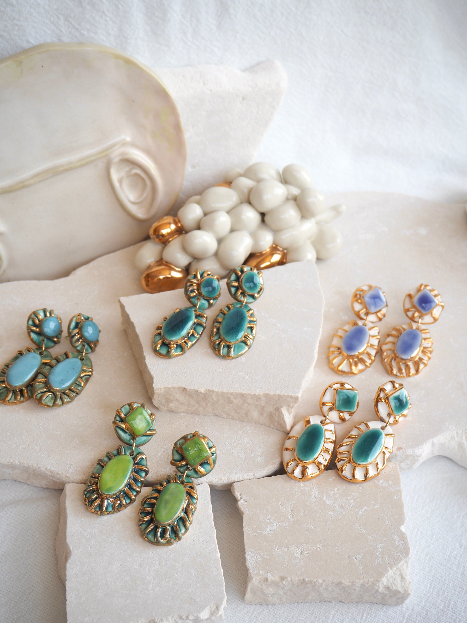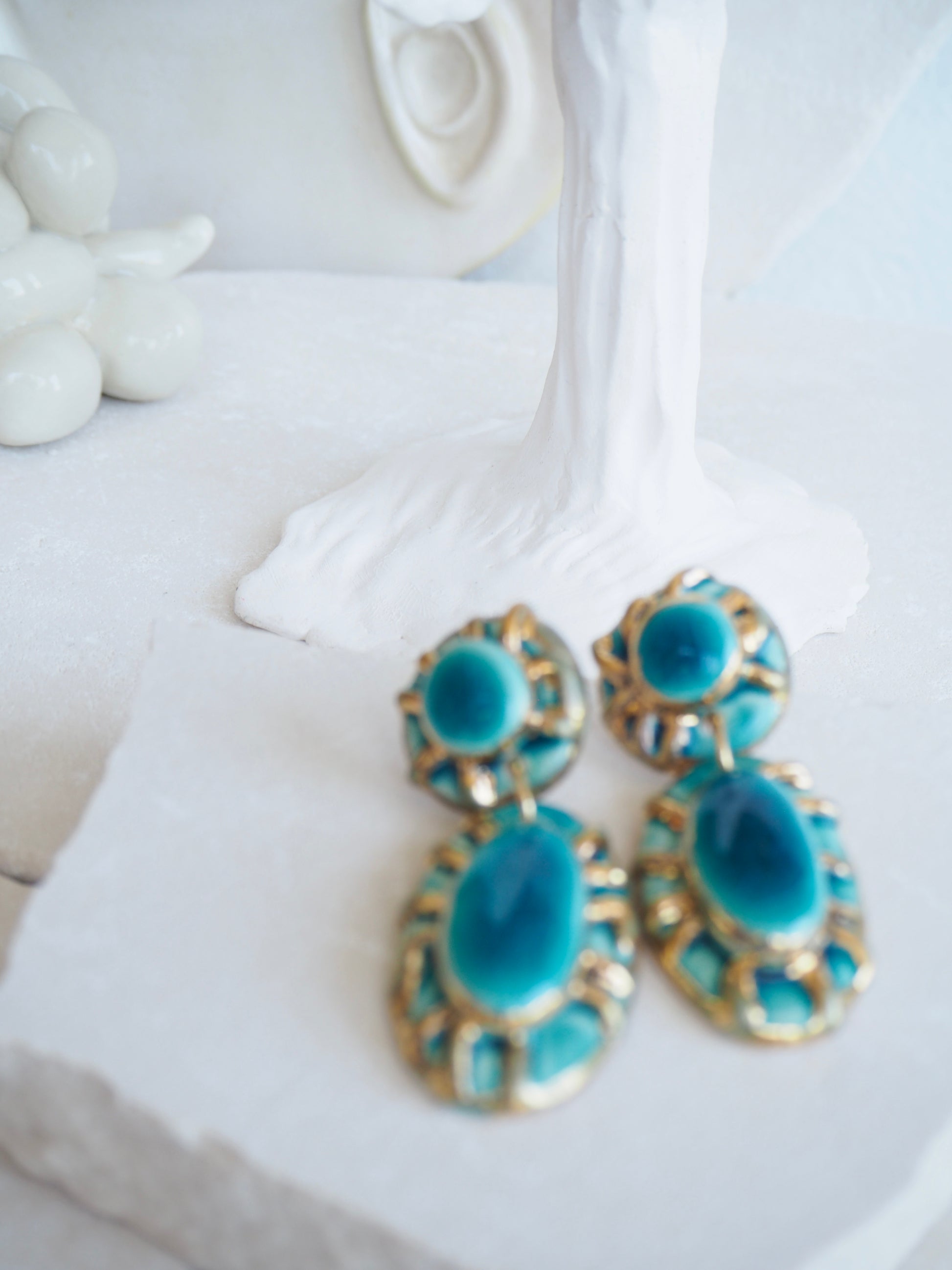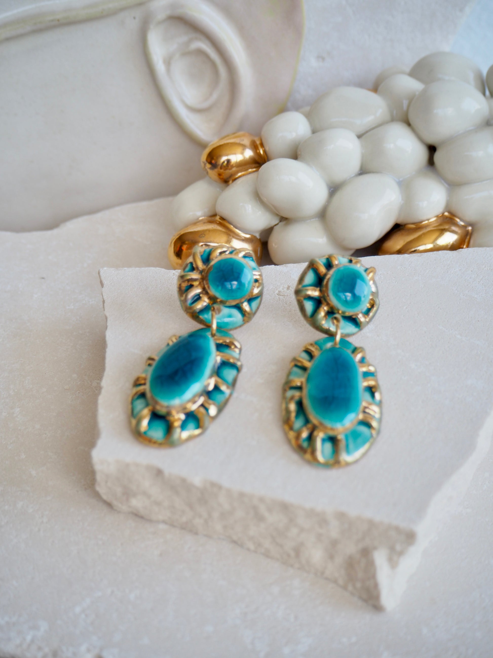 All Earrings’s porcelain clay pieces were fired three times in a Ceramic Kiln for bisque firing, glaze firing and gold lustre firing.