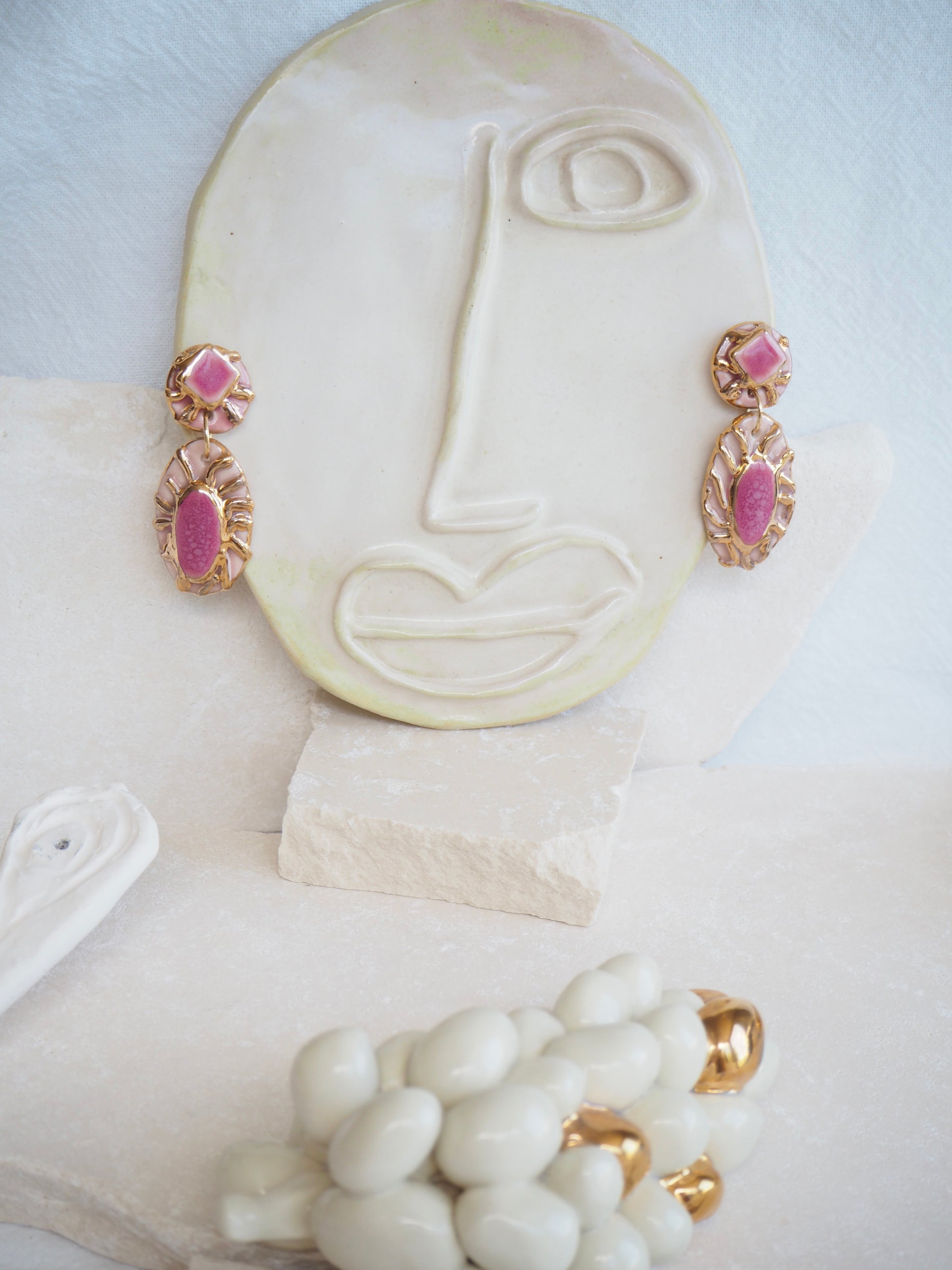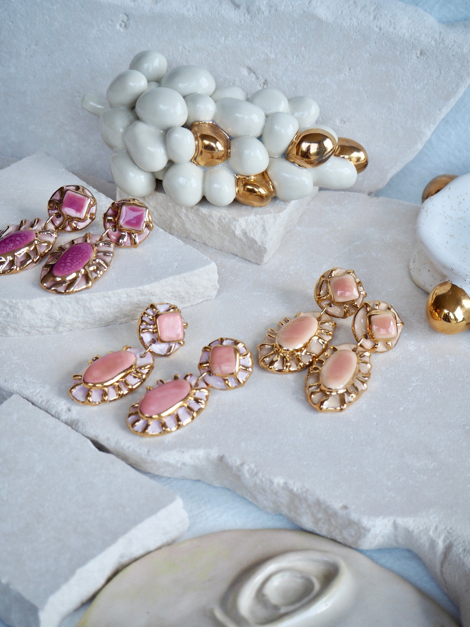 Pietra Collection handmade Porcelain Earrings coloured with Dark and Light Pink glossy glaze with 24k gold lustre details