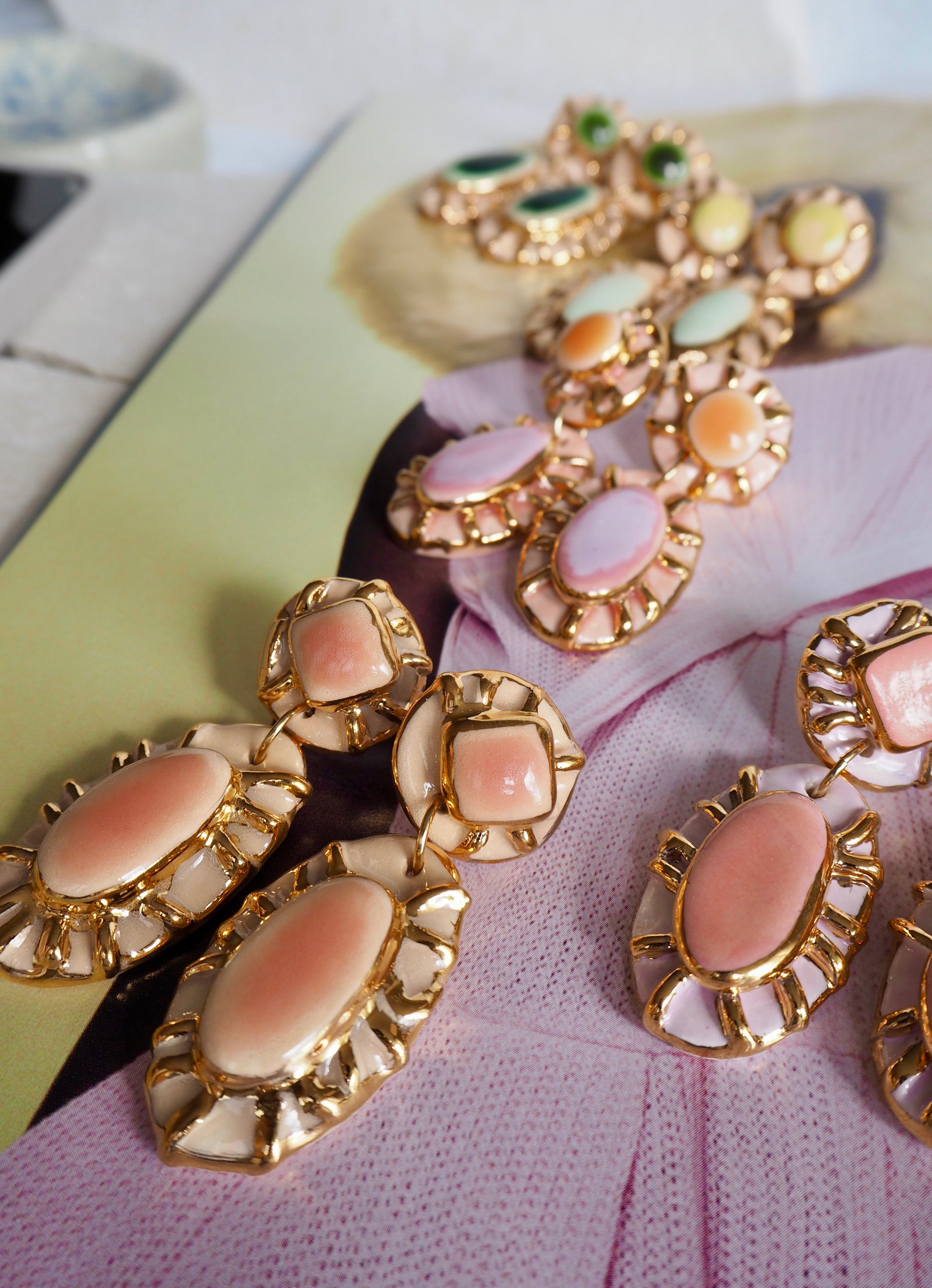 All Earrings’s porcelain clay pieces were fired three times in a Ceramic Kiln for bisque firing, glaze firing and gold lustre firing.