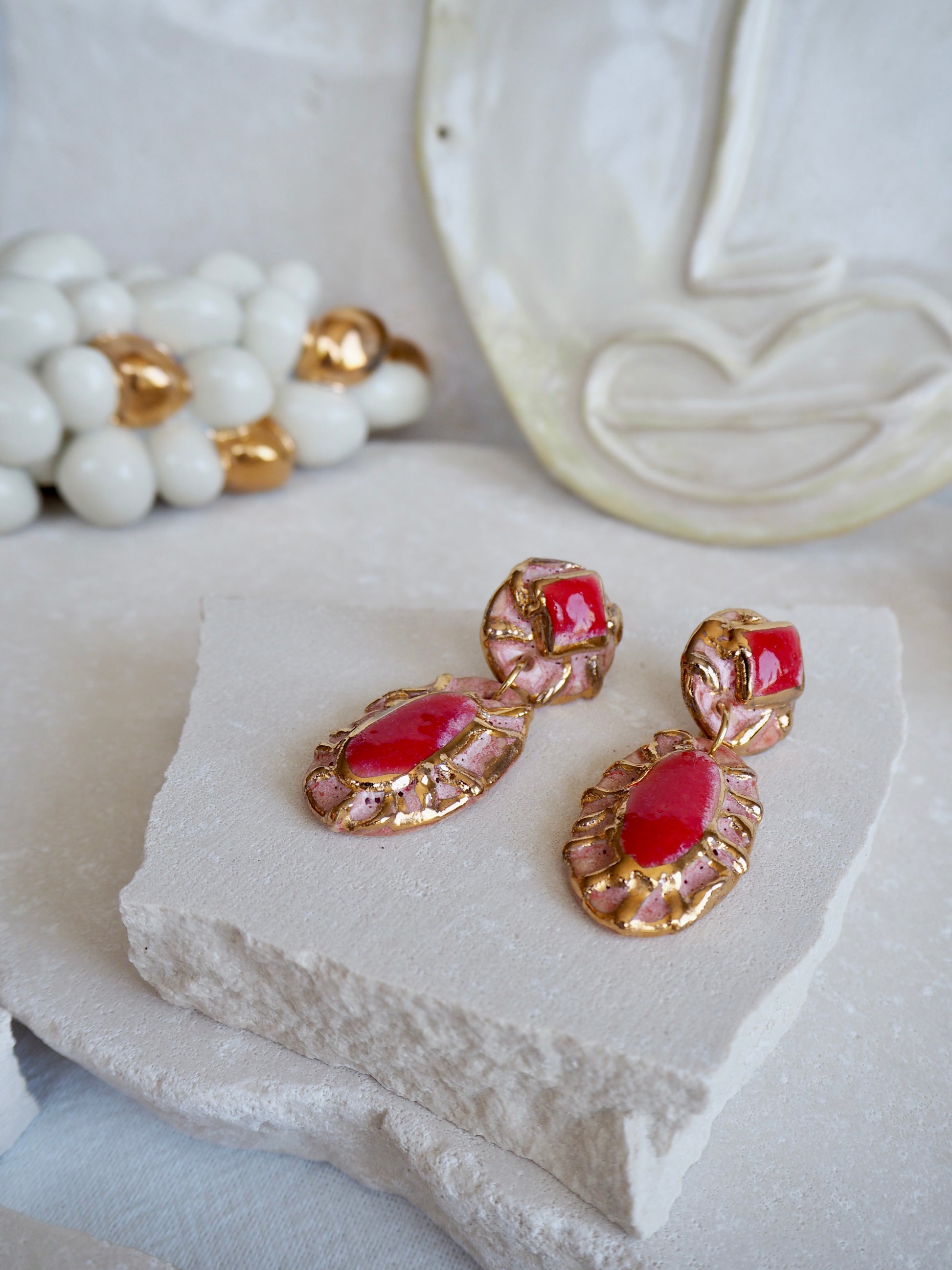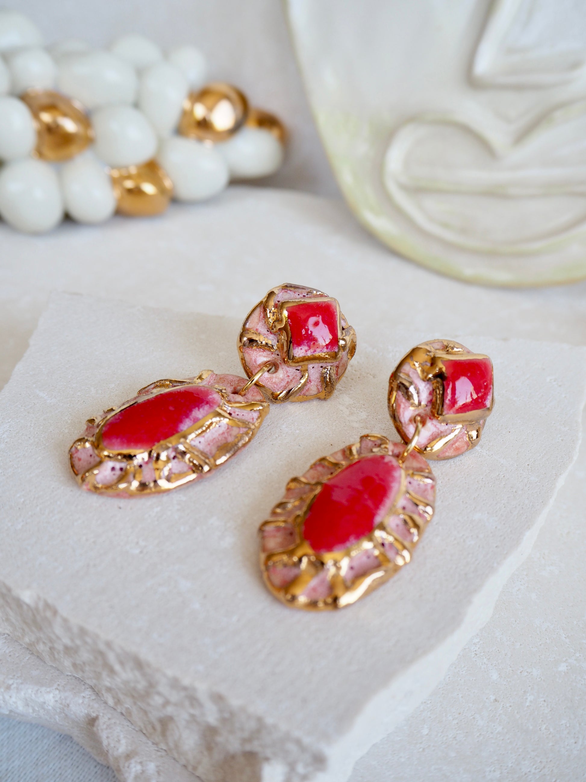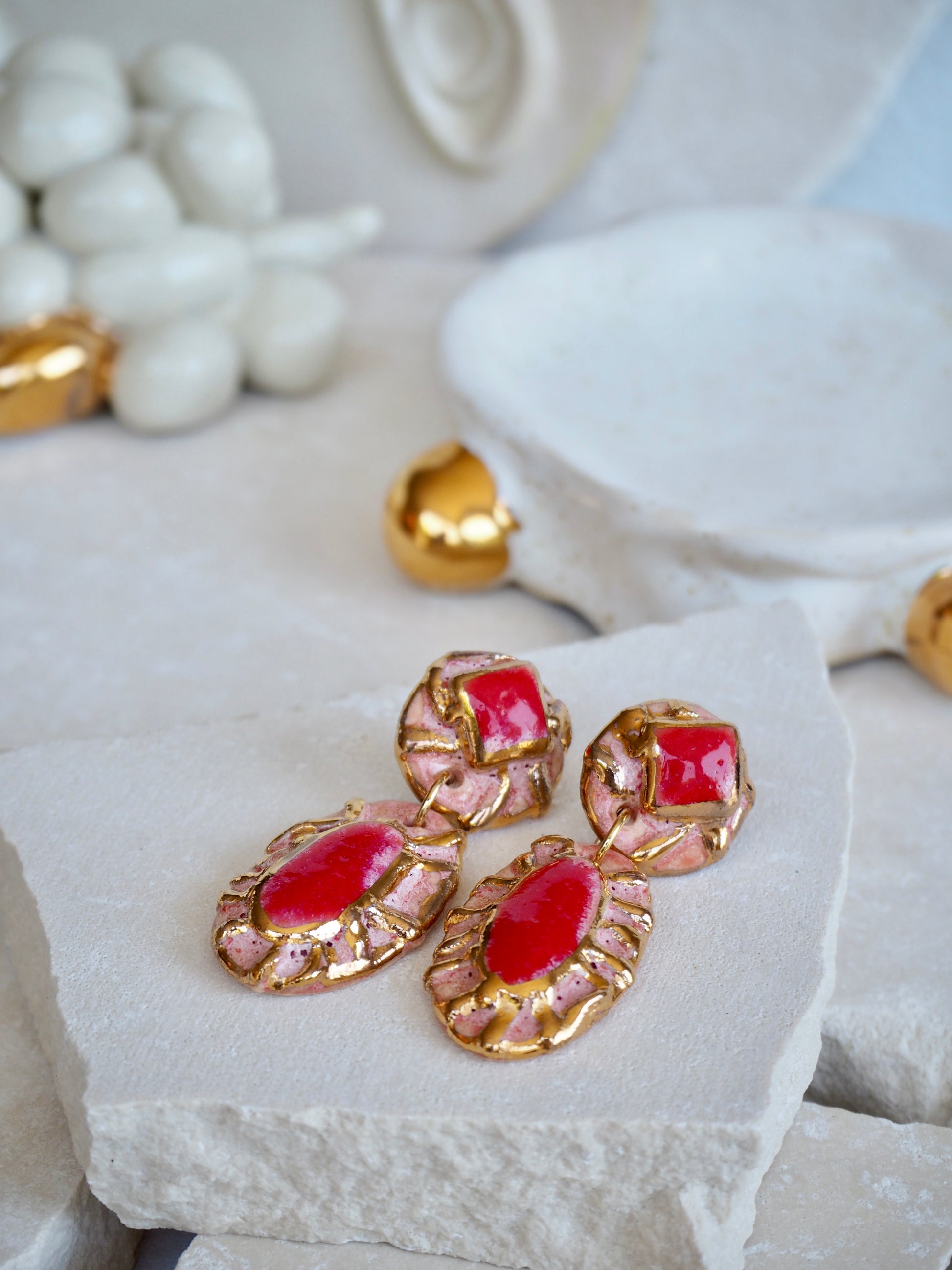 Pietra Collection handmade Porcelain Earrings coloured with Red and Pink glossy glaze with 24k gold lustre details