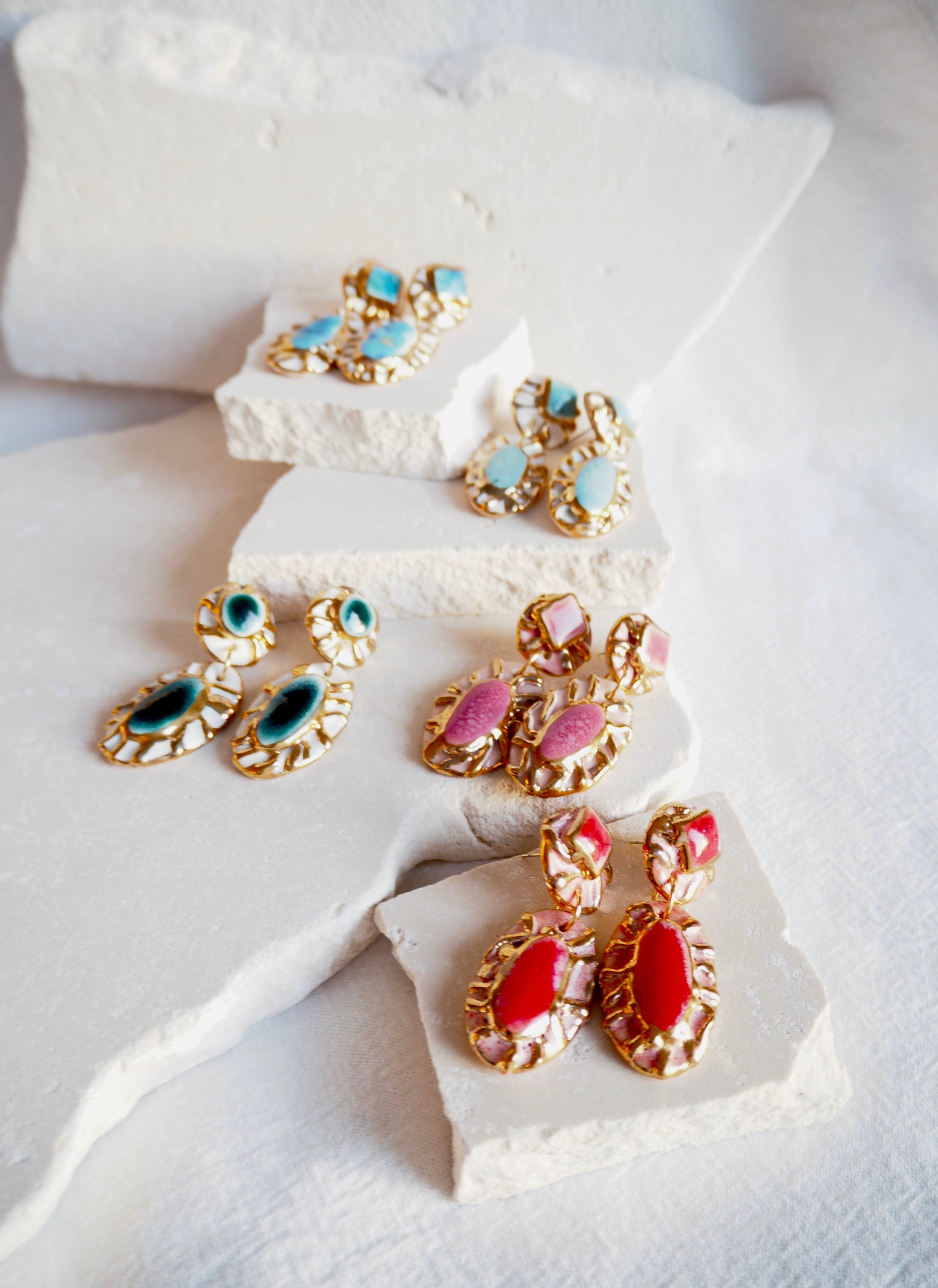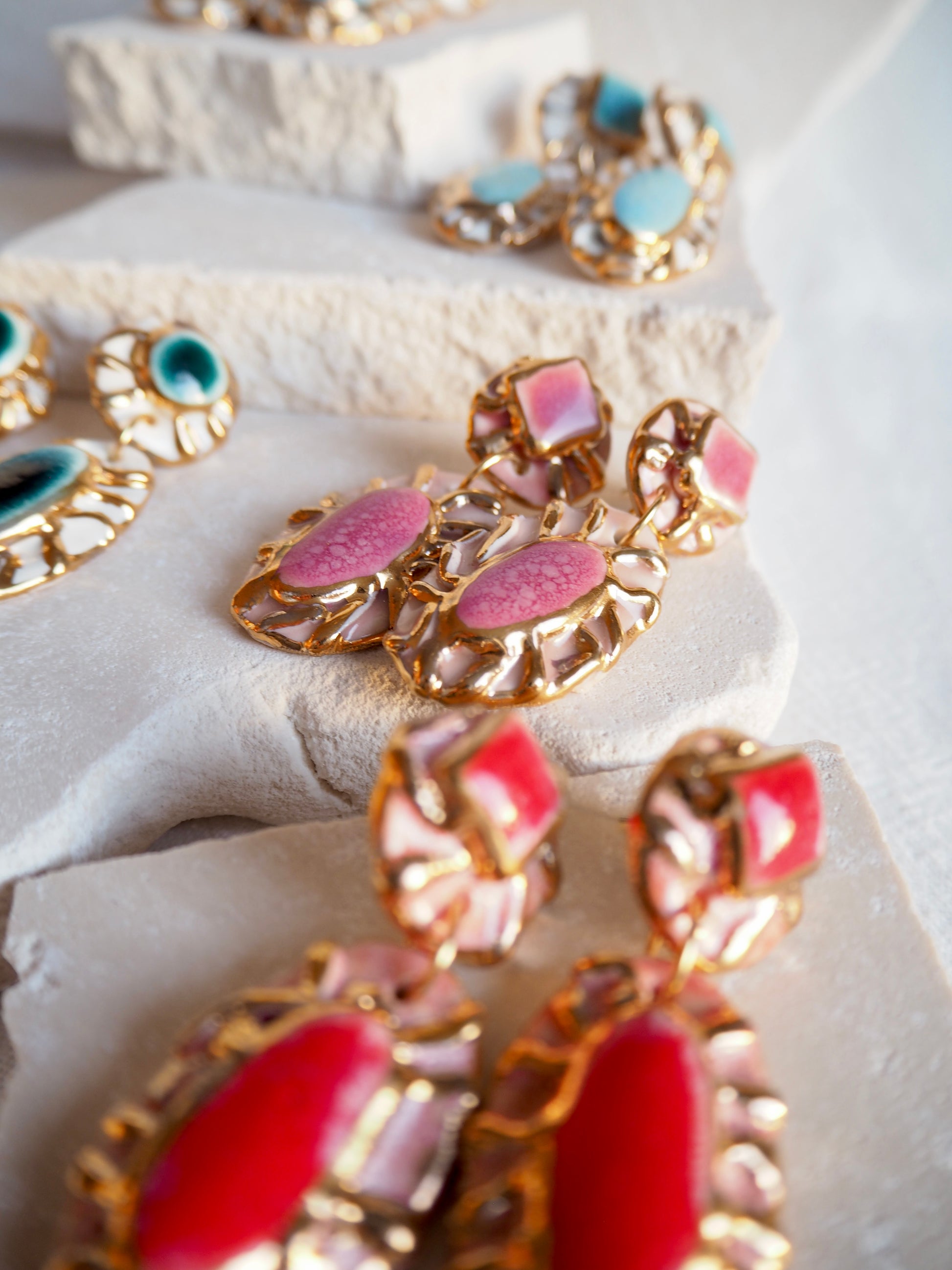 All Earrings’s porcelain clay pieces were fired three times in a Ceramic Kiln for bisque firing, glaze firing and gold lustre firing.