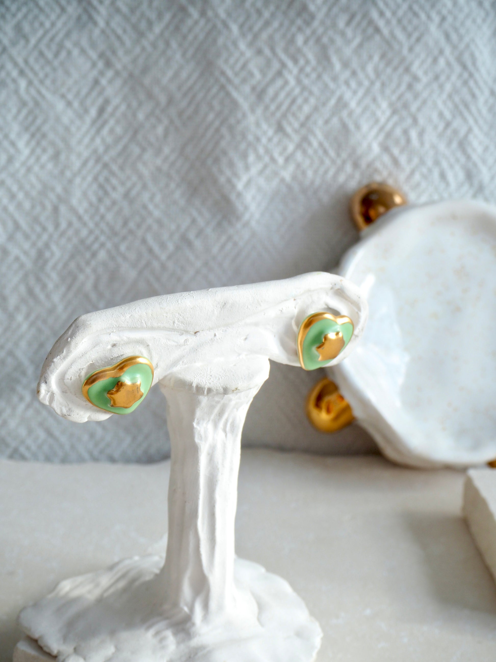Handmade Porcelain Vintage Style Heart Studs with 24k real Gold lustre hand painted details.