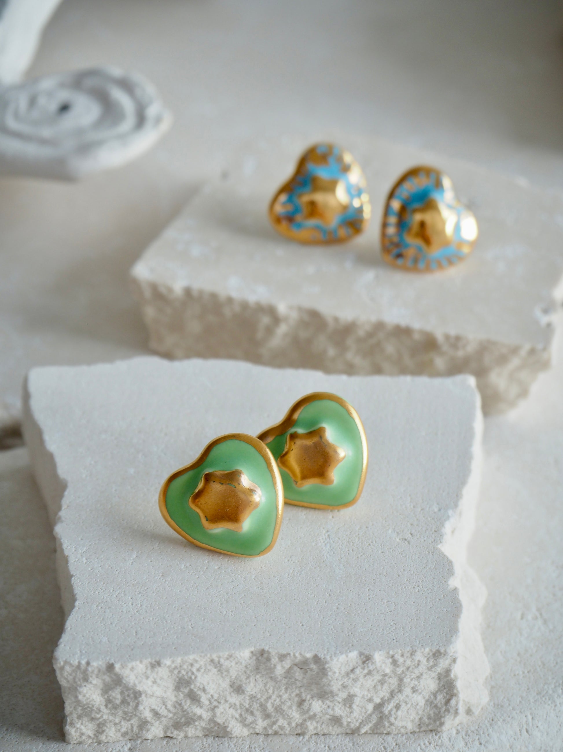 Small Handmade Porcelain Heart Stud coloured with “Bright Green” glaze with 24k Gold lustre details and Gold center Star