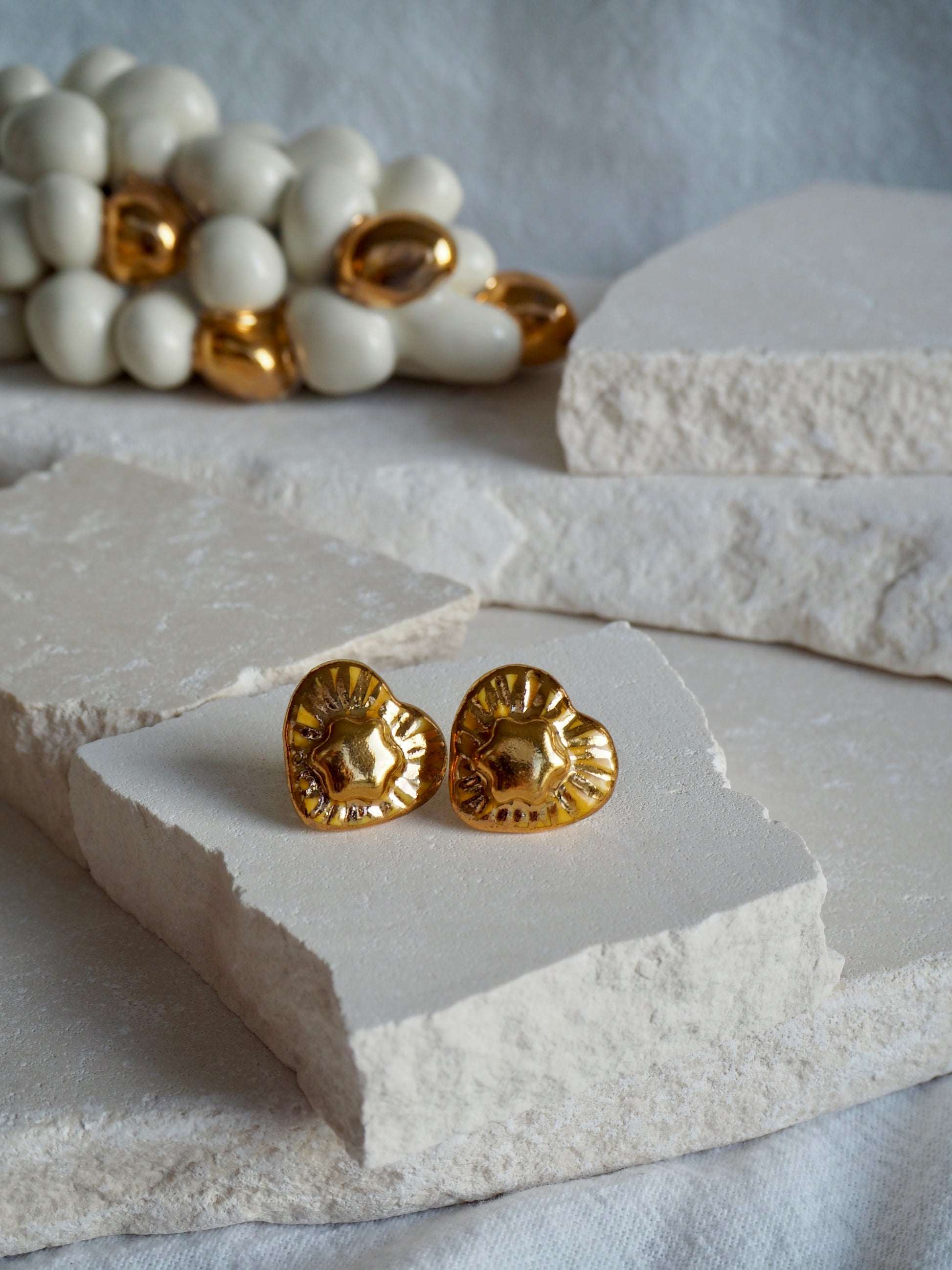 Handmade Porcelain Vintage Style Heart Studs with 24k real Gold lustre hand painted details.