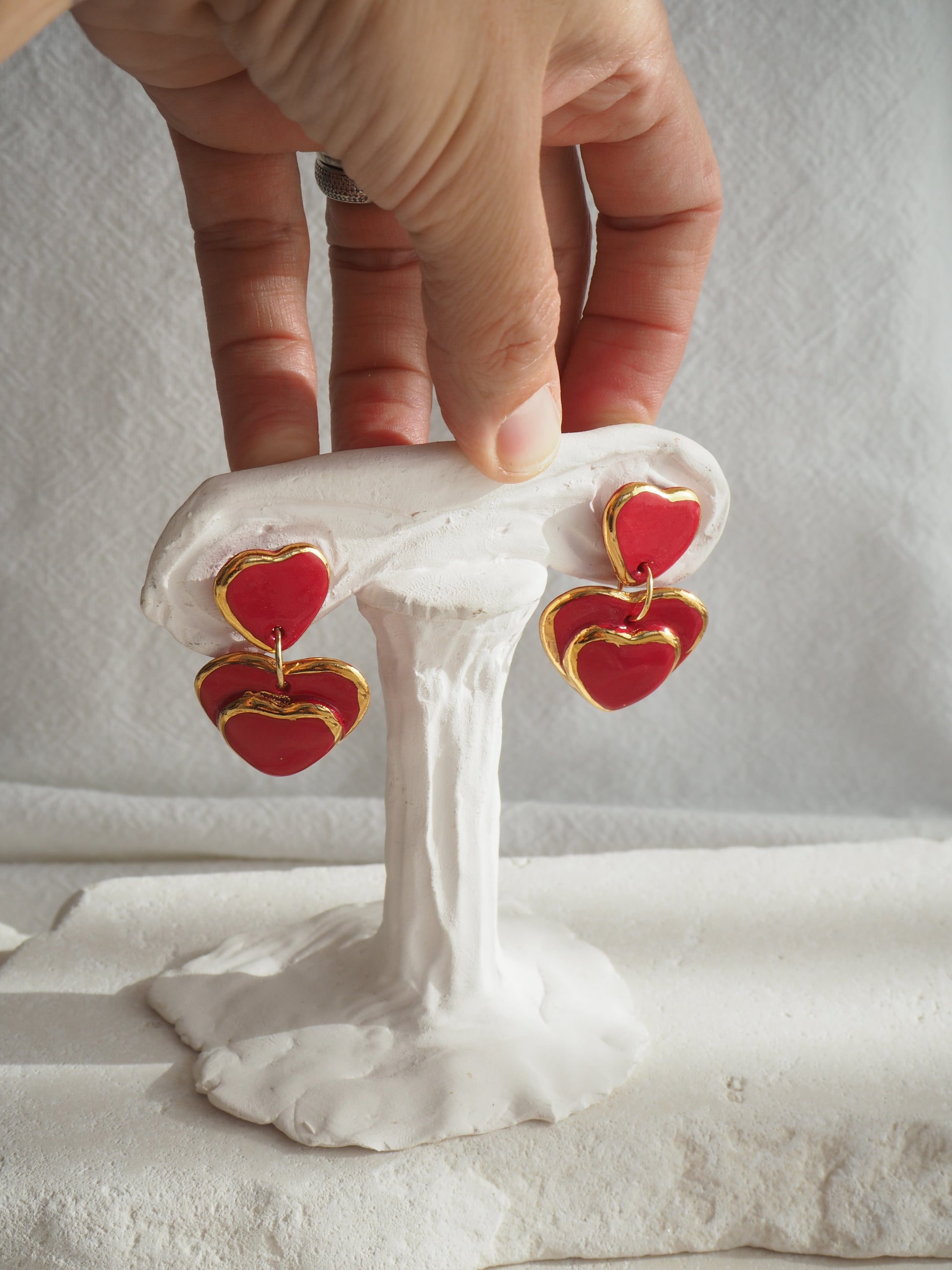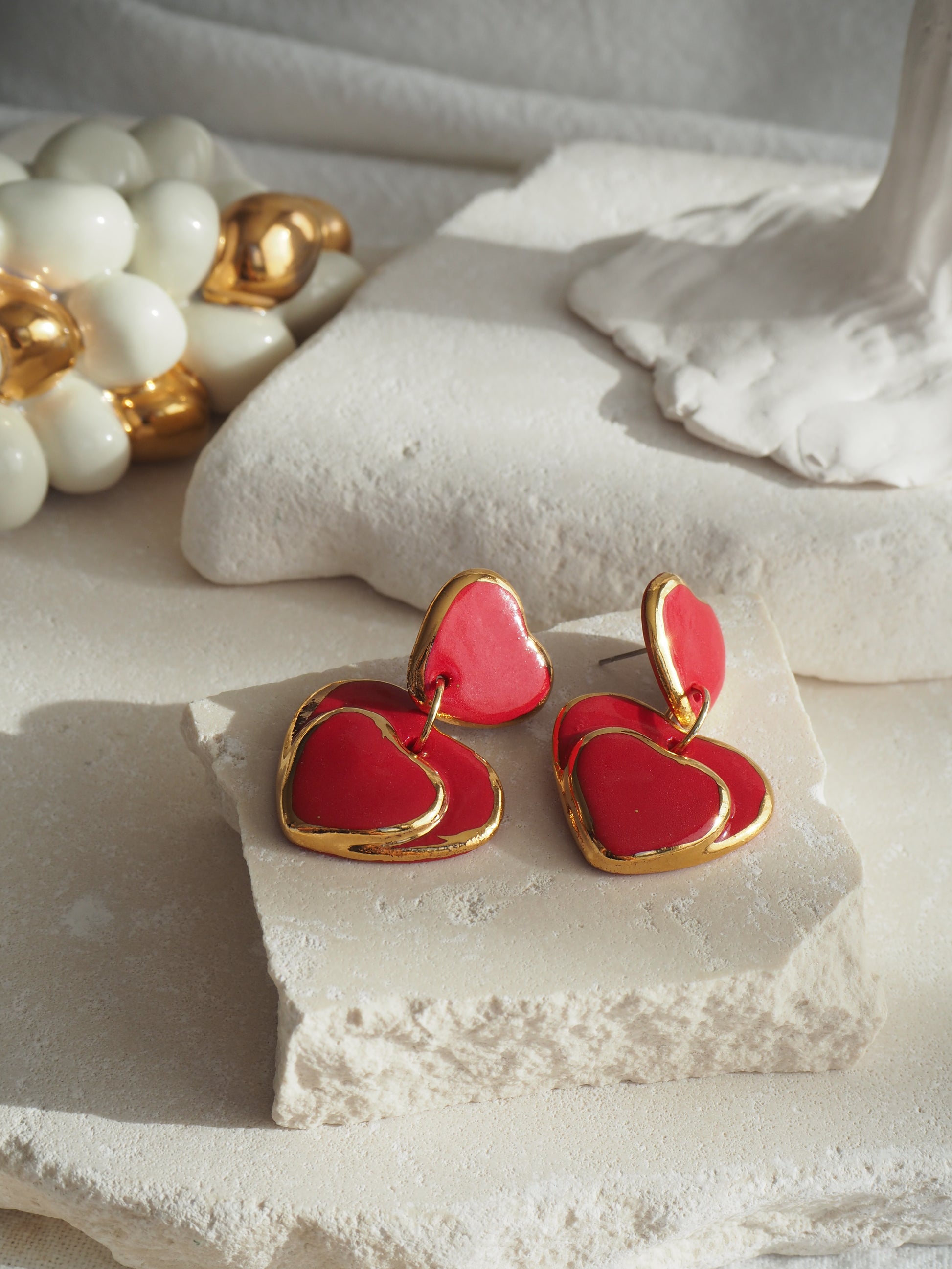Handmade Porcelain Heart Earrings coloured with Glossy Red glaze with 24k Gold lustre rims