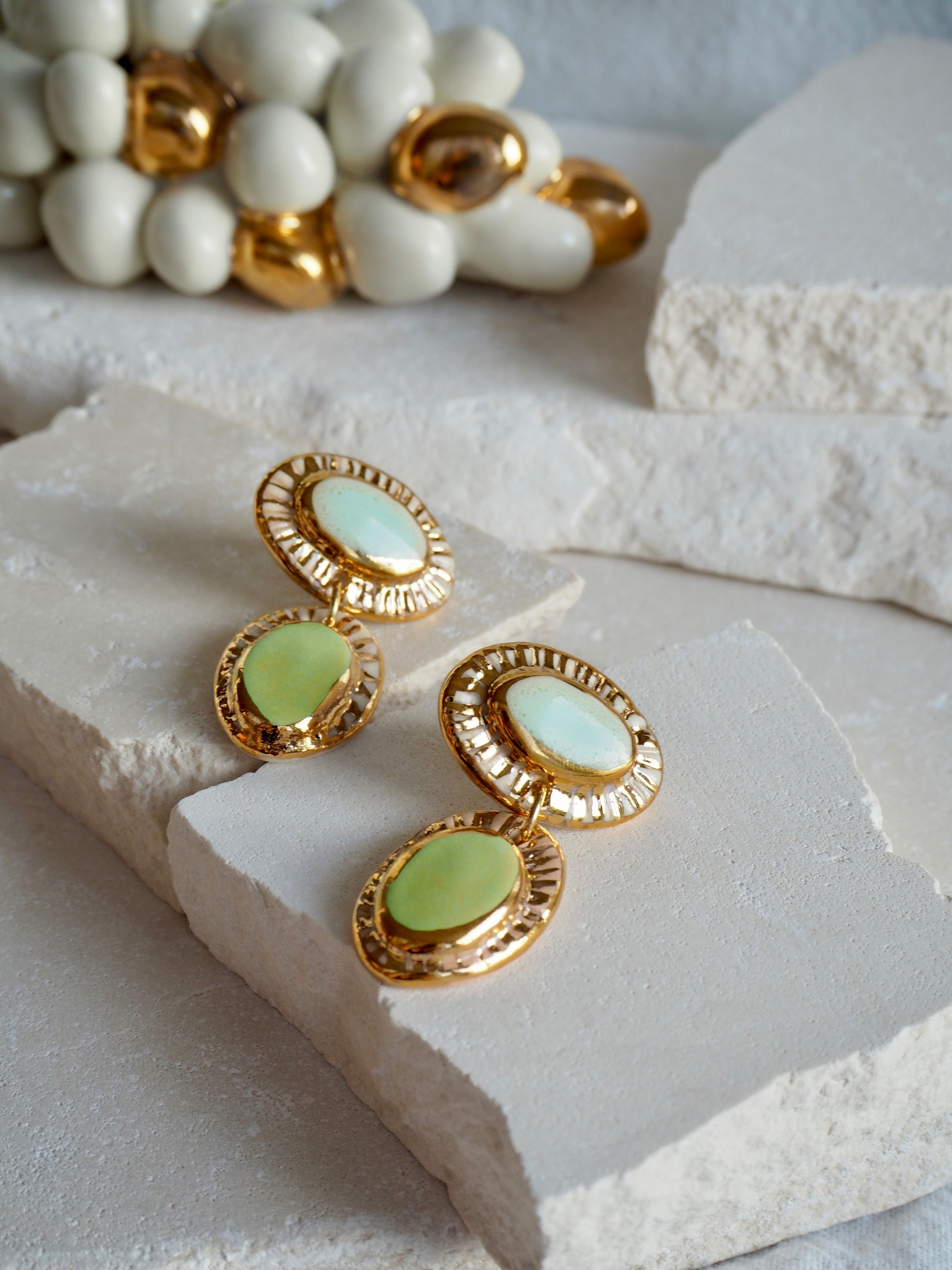 Hideaway Bay “Anima” Handmade Porcelain Earrings with Parchment underglaze and Green & Pale blue glazes with 24k gold lustre rays