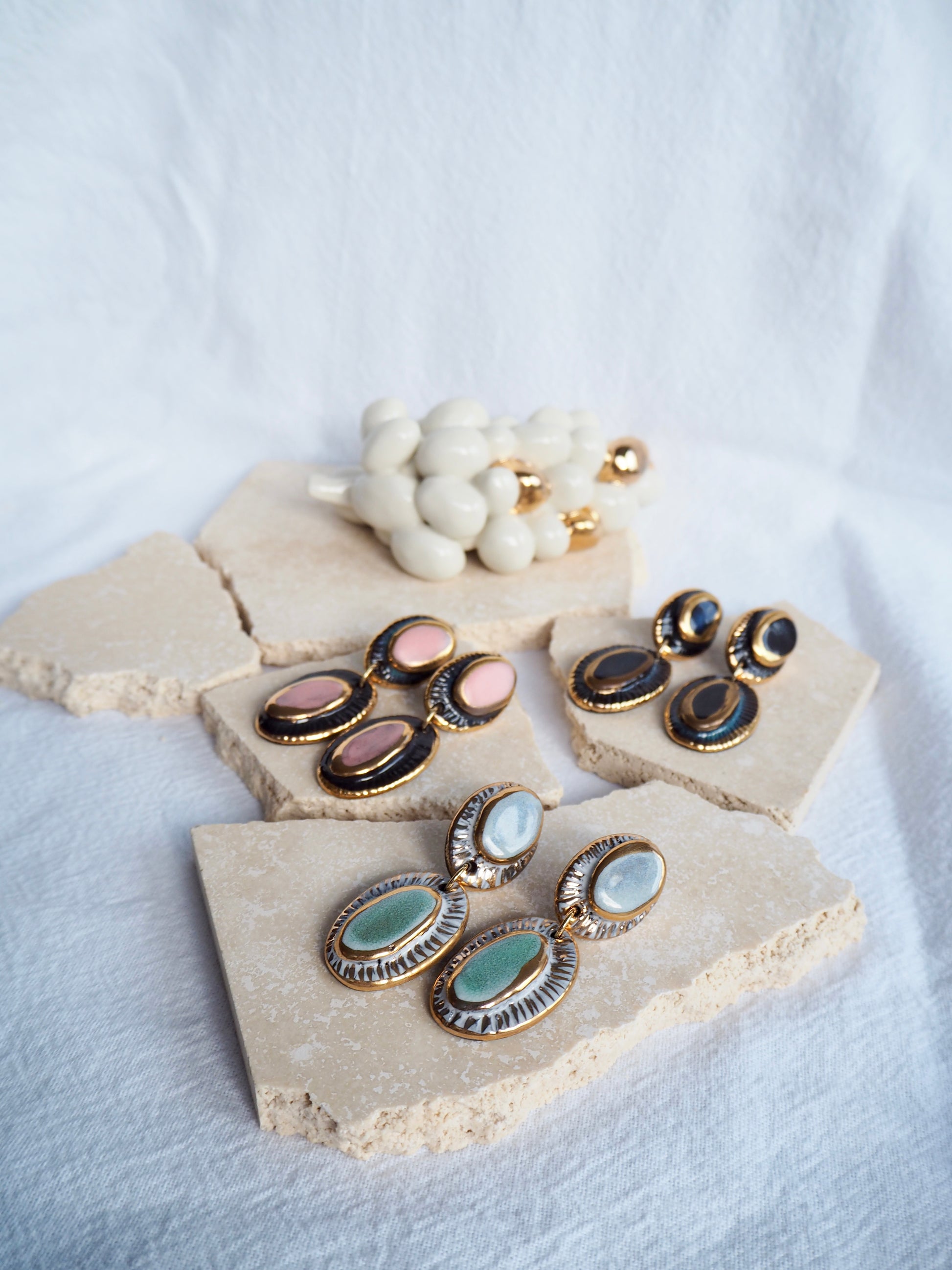 All Earrings’s porcelain clay pieces were fired three times in a Ceramic Kiln for bisque firing, glaze firing and gold lustre firing.