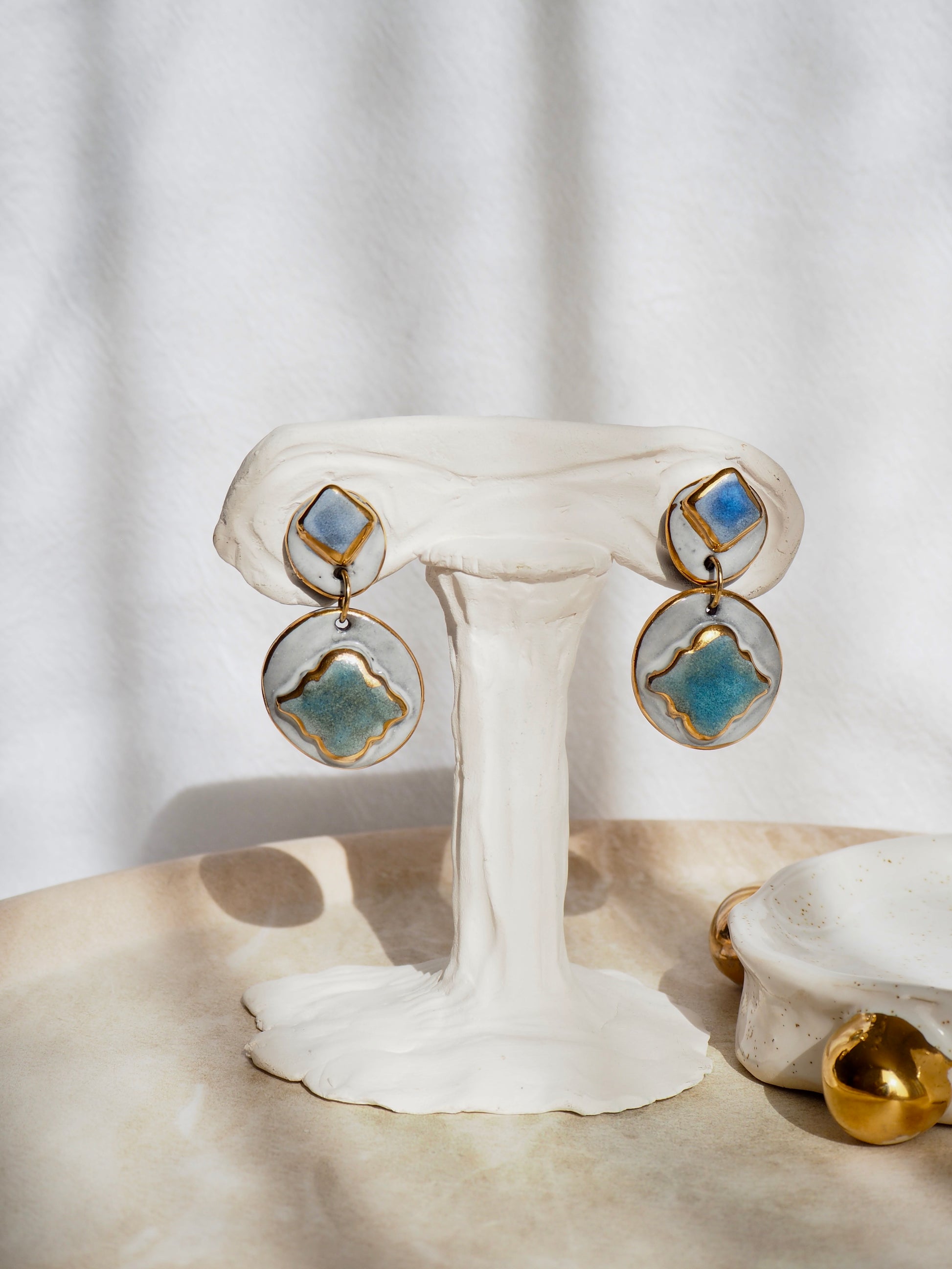All Earrings’s porcelain clay pieces were fired three times in a Ceramic Kiln for bisque firing, glaze firing and gold lustre firing.