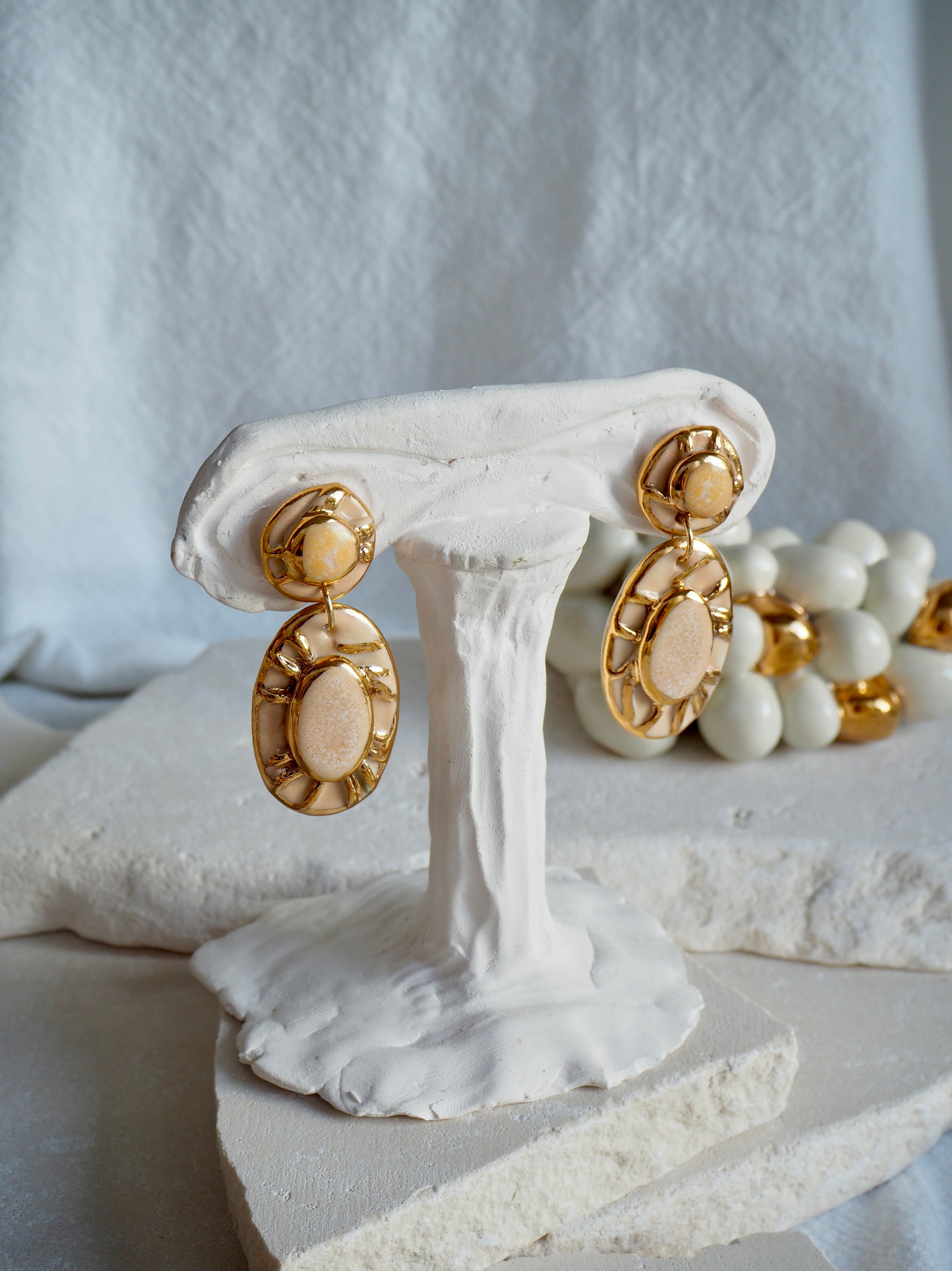 Pietra Collection handmade Porcelain Earrings coloured with Shades of Cream glossy glaze with 24k gold lustre details